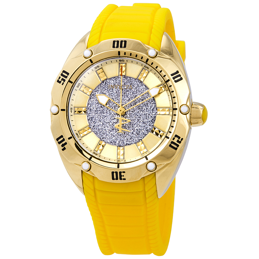 Yellow gold-tone stainless steel case with a yellow silicone strap. Yellow gold-tone stainless steel bezel. Yellow gold (glitter centered) dial with yellow gold-tone hands and index hour markers. Minute markers around the outer rim. Dial Type: Analog. Luminescent hands and markers. Hattori Caliber PC21 quartz movement. Scratch resistant flame fusion crystal. Pull / push crown. Solid case back. Round case shape. Case size: 38 mm. Band width: 21 mm, band length: 8.2 inches. Tang clasp. Water resistant at 100 meters / 330 feet. Functions: hour, minute, second. Dress watch style. Watch label: Japan Movt. Invicta Venom Yellow Gold Dial Yellow Silicone Ladies Watch 26148.