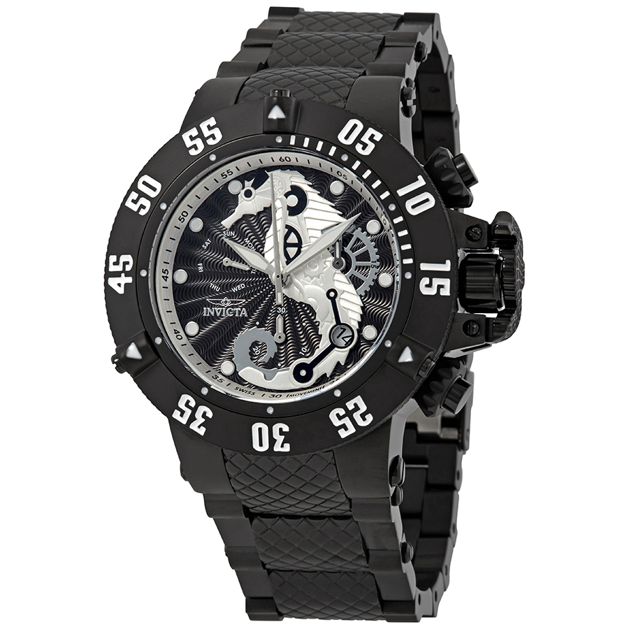 Black stainless steel case with a black stainless steel bracelet. Uni-directional rotating silver-tone bezel. Black dial with silver-tone hands and index hour markers. Minute markers around the outer rim. Dial Type: Analog. Luminescent hands and markers. Date display between 4 and 5 o'clock position. Chronograph - three sub-dials displaying: 60 second and 30 minute. day of the week sub-dial at the 9 o'clock position. Ronda Caliber Z60 quartz movement. Scratch resistant flame fusion crystal. Screw down crown. Solid case back. Round case shape. Case size: 50 mm. Band width: 28 mm, band length: 8.25 inches. Fold over with safety release clasp. Water resistant at 500 meters / 1650 feet. Functions: chronograph, date, day, hour, minute, small second. Dive watch style. Watch label: Swiss Movt. Invicta Subaqua Seahorse Chronograph Black Dial Mens Watch 26232.