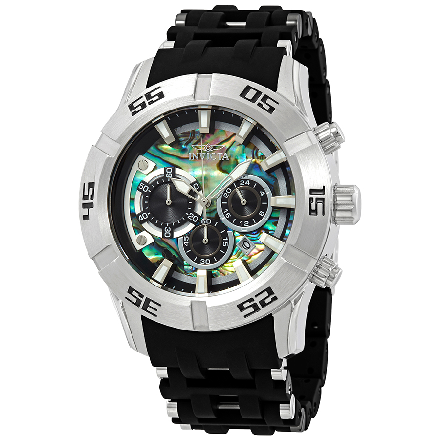 Silver-tone stainless steel case with a two-tone (black and silver-tone) polyurethane and stainless steel bracelet. Fixed silver-tone stainless steel bezel. Mother of pearl black dial with silver-tone hands and index hour markers. Minute markers around the outer rim. Dial Type: Analog. Luminescent hands and markers. Date display between 4 and 5 o'clock position. Chronograph - three sub-dials displaying: 60 second, 60 minute and 24 hour. Hattori Caliber VD53 quartz movement. Scratch resistant flame fusion crystal. Pull / push crown. Solid case back. Round case shape, case size: 50 mm, case thickness: 16 mm. Band width: 26 mm, band length: 8 inches. Deployment with push button release clasp. Water resistant at 100 meters / 330 feet. Functions: chronograph, date, GMT, second time zone, hour, minute, second. Sport watch style. Invicta Sea Spider Chronograph Mens Watch 26529.