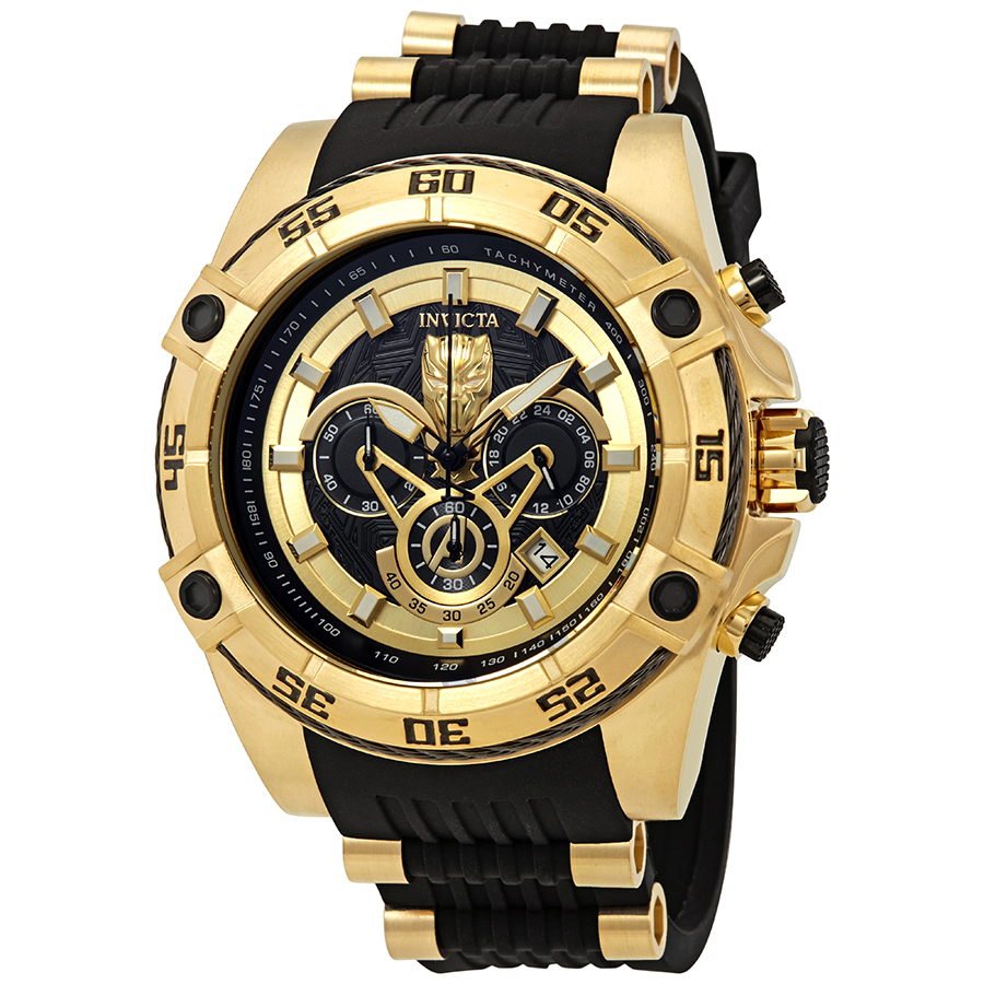 Gold-tone stainless steel case with a black silicone and yellow gold-plated stainless steel ba strap. Uni-directional rotating yellow gold-plated stainless steel with black cable wire trim bezel. Black dial with luminous yellow gold-tone hands and index hour markers. Tachymeter markers around the outer rim. Dial Type: Analog. Luminescent hands and markers. Date display between the 4 and 5 o'clock positions. Chronograph - three sub-dials displaying: 60 second, 60 minute and 1/10th of a second. Hattori Caliber VD53 quartz movement. Scratch resistant flame fusion crystal. Pull / push crown. Solid case back. Round case shape, case size: 52 mm, case thickness: 19 mm. Band width: 26 mm, band length: 8.25 inches. Tang clasp. Water resistant at 100 meters / 330 feet. Functions: chronograph, date, hour, minute, second. Sport watch style. Watch label: Japan Movt. Invicta Marvel Black Panther Chronograph Black Dial Black Silicone Mens Watch 26803.