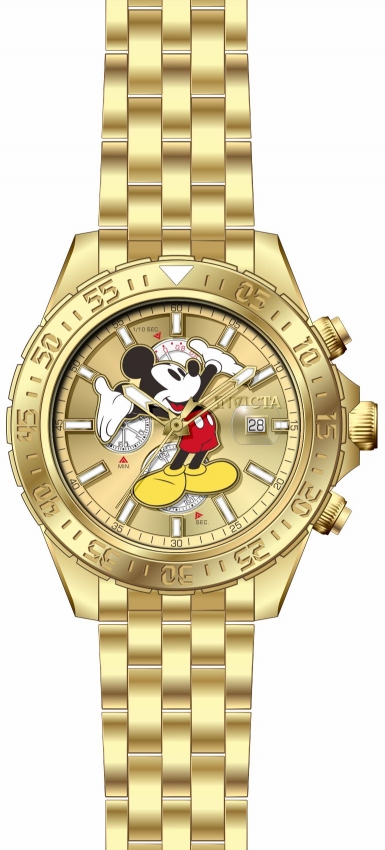 Gold-tone stainless steel case with a gold-tone stainless steel bracelet. Uni-directional rotating gold-tone stainless steel bezel. Gold-tone dial with gold-tone hands and index hour markers. Minute markers around the outer rim. Dial Type: Analog. Luminescent hands and markers. Date display at the 3 o'clock position. Chronograph - three sub-dials displaying: 1/10 second, 60 seconds and 60 minutes. Hattori Caliber VD57B quartz movement. Scratch resistant flame fusion crystal. Pull / push crown. Solid case back. Round case shape, case size: 47 mm, case thickness: 14 mm. Band width: 22 mm, band length: 8.25 inches. Fold over clasp. Water resistant at 100 meters / 330 feet. Functions: chronograph, alarm, date, hour, minute, second. Sport watch style. Watch label: Japan Movt. Invicta Disney Limited Edition Alarm Chronograph Gold Dial Mens Watch 27376.