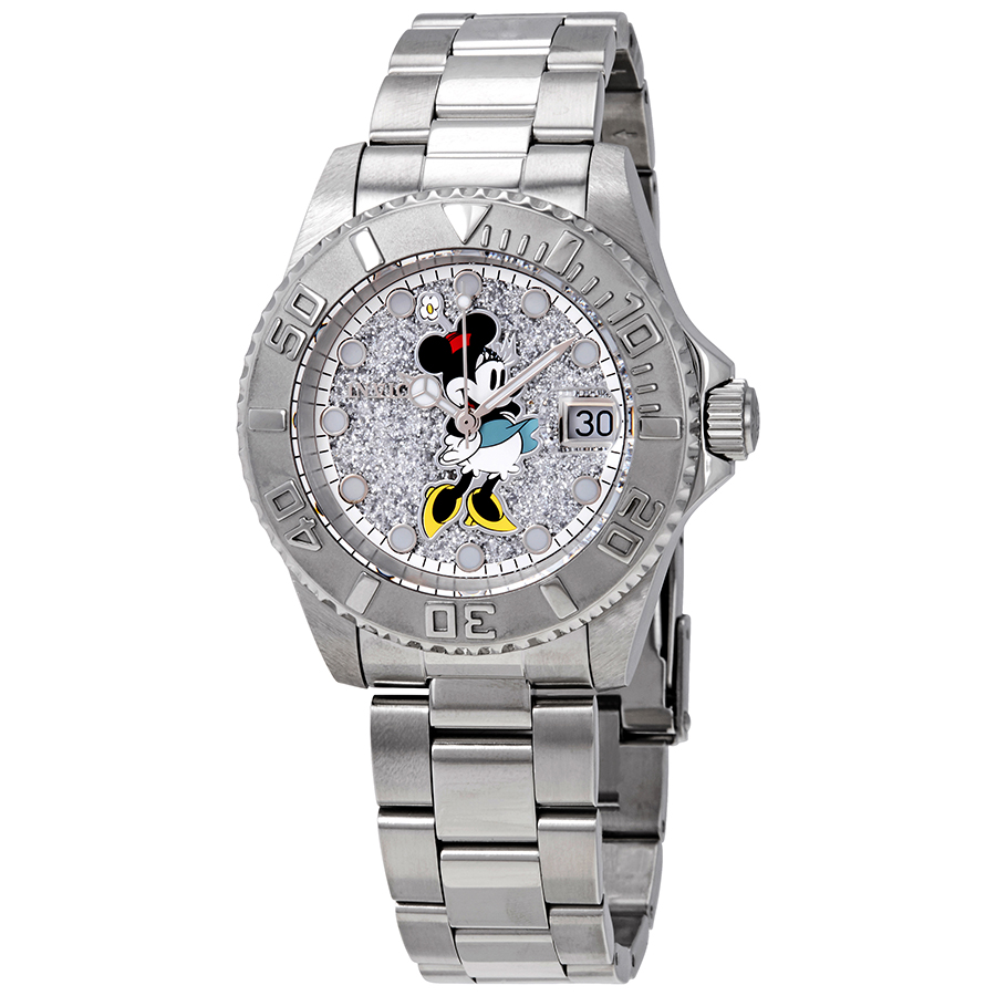 Silver-tone stainless steel case with a silver-tone stainless steel bracelet. Uni-directional rotating silver-tone stainless steel bezel. Silver-tone dial with silver-tone hands and index hour markers. Minute markers around the outer rim. Dial Type: Analog. Luminescent hands and markers. Date display at the 3 o'clock position. Ronda Caliber 515 quartz movement. Scratch resistant mineral crystal. Screw down crown. Solid case back. Round case shape, case size: 40mm, case thickness: 12 mm. Band width: 20 mm, band length: 8.2 inches. Fold over with safety release clasp. Water resistant at 200 meters / 660 feet. Functions: date, hour, minute, second. Casual watch style. Watch label: Japan Movt. Invicta Disney Limited Edition Minnie Mouse Silver Dial Ladies Watch 27384.