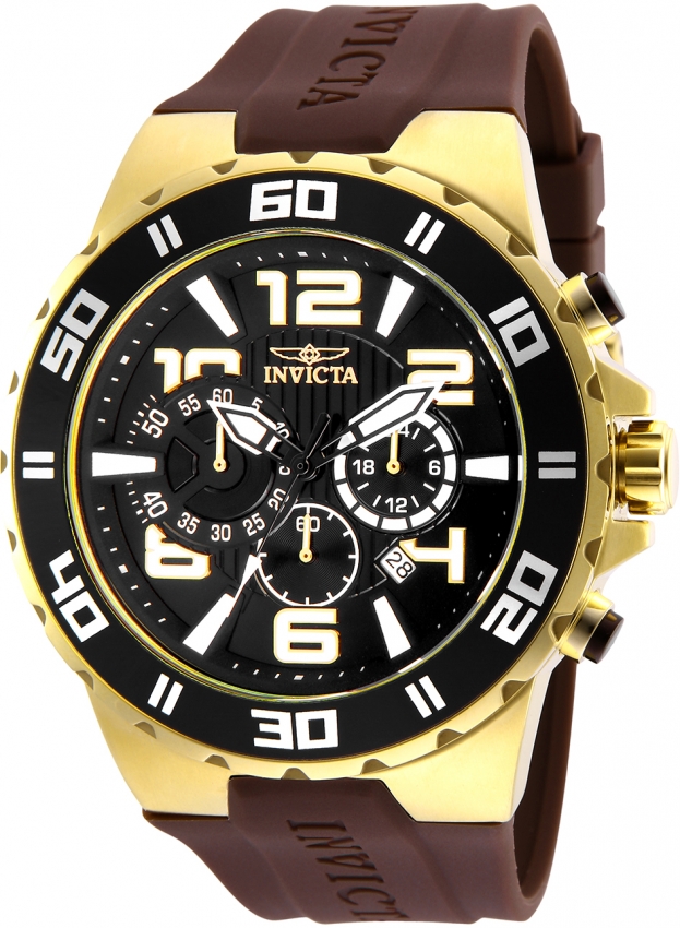 Yellow gold-tone stainless steel case with a brown silicone and polyurethane strap. Uni-directional rotating yellow gold-tone bezel with a black ring. Black dial with black hands and alternating Arabic numeral and index hour markers. Minute markers around the outer rim. Dial Type: Analog. Luminescent hands and markers. Date display between the 4 and 5 o'clock positions. Chronograph - three sub-dials displaying: 60 second, 60 minute and 24 hour. Hattori Caliber VD53 quartz movement. Scratch resistant flame fusion crystal. Pull / push crown. Solid case back. Round case shape. Case size: 52 mm. Case thickness: 14 mm. Band width: 32 mm. Band length: 8.5 inches. Tang clasp. Water resistant at 100 meters / 330 feet. Functions: chronograph, date, GMT, second time zone, hour, minute, second. Pro Diver Series. Sport watch style. Watch label: Japan Movt. Invicta Pro Diver Chronograph Quartz Black Dial Mens Watch 27531.