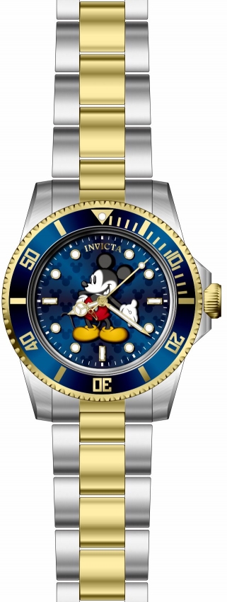 Silver-tone stainless steel case with a two-tone (silver-tone and gold-tone) stainless steel bracelet. Uni-directional rotating blue stainless steel bezel. Blue dial with gold-tone hands and index hour markers. Minute markers around the outer rim. Dial Type: Analog. Luminescent hands and markers. TMI Caliber PC21J quartz movement. Scratch resistant mineral crystal. Pull / push crown. Solid case back. Round case shape. Case size: 40 mm. Band width: 20 mm, band length: 8 inches. Fold over clasp. Water resistant at 100 meters / 330 feet. Functions: hour, minute, second. Casual watch style. Watch label: Japan Movt. Invicta Disney Limited Edition Quartz Blue Dial Mens Watch 29671.
