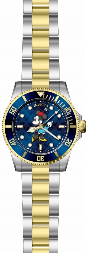 Silver-tone stainless steel case with a two-tone (silver-tone and gold-tone) stainless steel bracelet. Uni-directional rotating blue stainless steel bezel. Blue dial with silver-tone hands and index hour markers. Minute markers around the outer rim. Dial Type: Analog. Luminescent hands and markers. TMI Caliber PC21J quartz movement. Scratch resistant mineral crystal. Pull / push crown. Solid case back. Round case shape. Case size: 36 mm. Band width: 18 mm, band length: 7.75 inches. Fold over clasp. Water resistant at 100 meters / 330 feet. Functions: hour, minute, second. Casual watch style. Watch label: Japan Movt. Invicta Disney Limited Edition Quartz Blue Dial Ladies Watch 29677.
