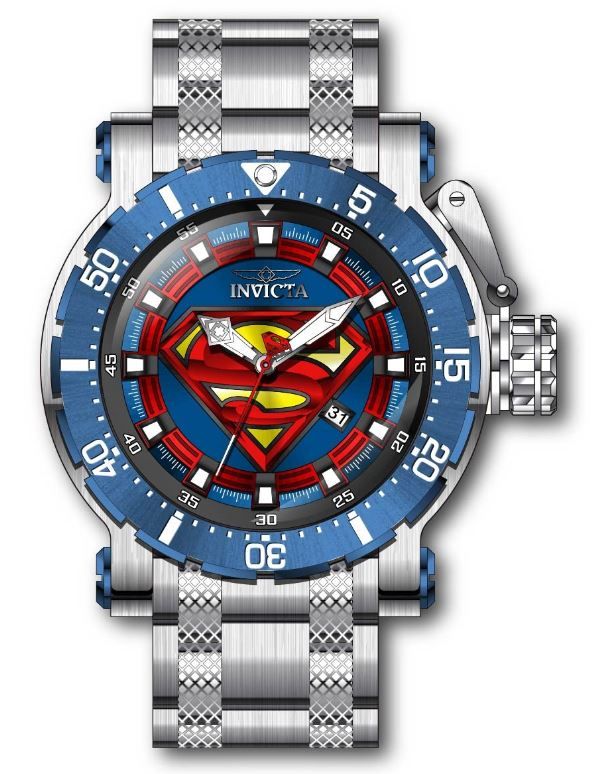 Stainless steel case with a stainless steel bracelet. Uni-directional rotating blue-plated bezel. Blue and red (Superman) dial with luminous silver-tone hands and index hour markers. Minute markers. Arabic numeral minute markers (at 5 minute intervals) around the outer rim. Dial Type: Analog. Luminescent hands and markers. Date display at the 4 o'clock position. Quartz movement. Scratch resistant mineral crystal. Pull / push crown. Solid case back. Round case shape. Case size: 48 mm. Band width: 24 mm. Fold over clasp with a safety release. Water resistant at 100 meters / 330 feet. Functions: date, hour, minute, second. Dc Comics Series. Invicta DC Comics Superman Quartz Blue Dial Mens Watch 32495.