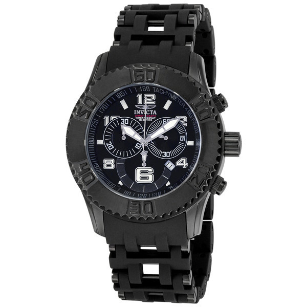 Black ion-plated stainless steel case with a black ion-plated stainless steel bracelet. Uni-directional rotating black ion-plated stainless steel bezel. Black dial with luminous hands and alternating Arabic numeral and index hour markers. Tachymeter scale around the outer rim. Dial Type: Analog. Luminescent hands and markers. Date display at the 4 o'clock position. Chronograph - three sub-dials displaying: 60 second, 30 minute and 12 hour. Ronda Caliber 5030.D quartz movement. Scratch resistant flame fusion crystal. Pull / push crown. Solid case back. Round case shape, case size: 50 mm, case thickness: 15 mm. Band width: 26 mm, band length: 8.5 inches. Fold over with safety release clasp. Water resistant at 100 meters / 330 feet. Functions: hours, minutes, seconds, calendar, chronograph. Sea Spider Series. Sport watch style. Watch label: Swiss Movt. Invicta Sea Spider Black Ion-Plated Chronograph Mens Watch 6713.