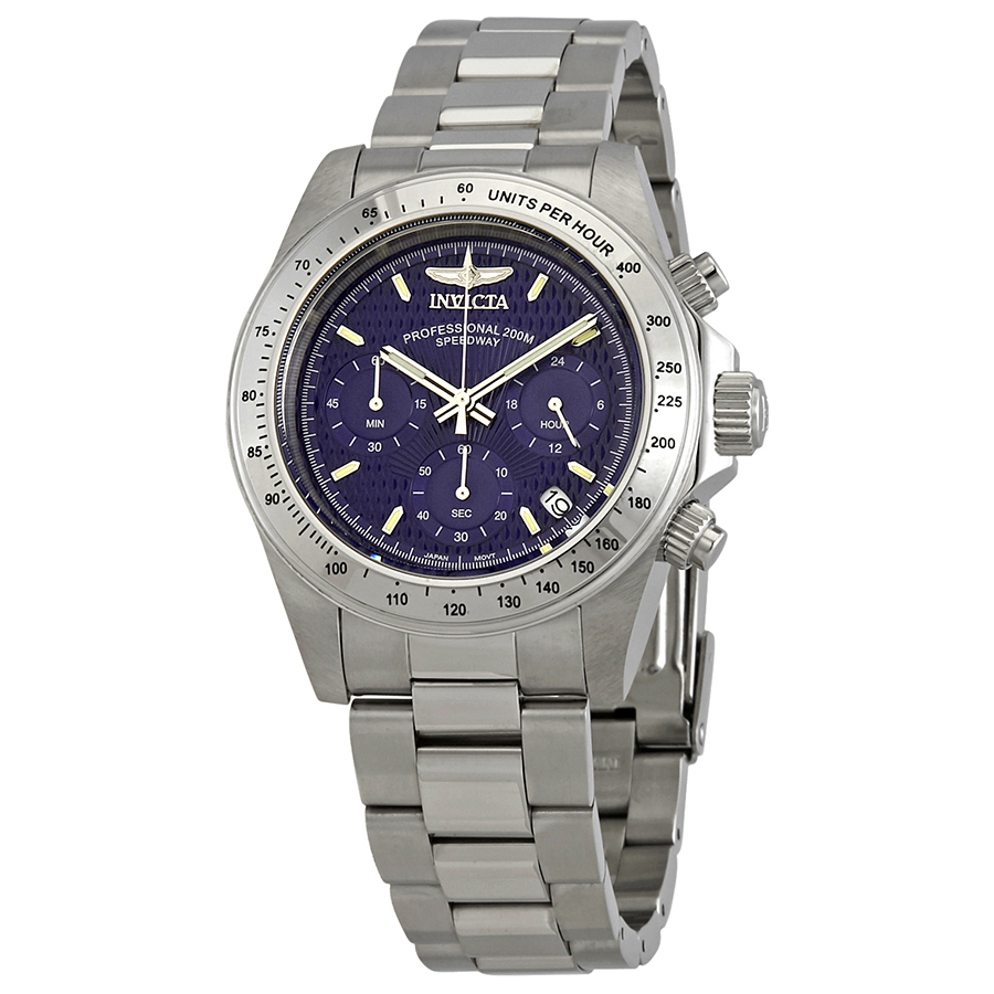 Stainless steel case with a stainless steel bracelet. Fixed stainless steel bezel showing tachymeter markings. Blue dial with luminous silver-tone hands and index hour markers. Minute markers around the outer rim. Dial Type: Analog. Luminescent hands and markers. Date display at the 4 o'clock position. Chronograph - three sub-dials displaying: 60 second, 30 minute and 12 hour. Hattori caliber VD53 quartz movement. Scratch resistant sapphire crystal. Screw down crown. Solid case back. Round case shape, case size: 41 mm, case thickness: 12 mm. Band width: 20 mm, band length: 7.85 inches. Fold over clasp with a safety release. Water resistant at 200 meters / 660 feet. Functions: chronograph, date, GMT, second time zone, hour, minute, second. Casual watch style. Invicta Speedway Chronograph Blue Dial Stainless Steel Mens Watch 7027.