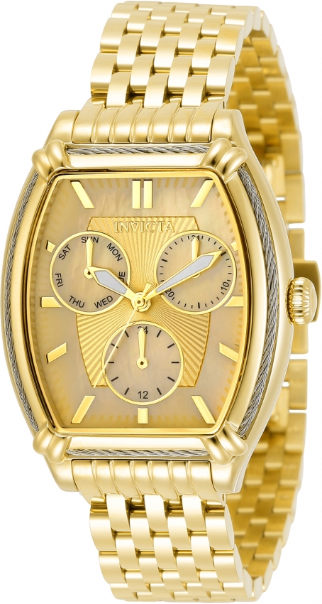 Gold-tone stainless steel case and bracelet. Fixed gold and silver stainless steel and cable bezel. Champagne dial with gold-tone hands and index hour markers. Minute markers around the outer rim. Dial Type: Analog. Luminescent hands. Date display at the 2 o'clock position. Three sub-dials displaying: date, day and 24 hour. Caliber VH68 quartz movement. Scratch resistant Flame Fusion crystal. Pull / push crown. Solid case back. Tonneau case shape, case size: 34 mm, case thickness: 9 mm. Band width: 16 mm, band length: 7.25 inches. Fold over clasp. Water resistant at 100 meters / 330 feet. Functions: date, day, GMT, second time zone, hour, minute, second. Wildflower Series. Casual watch style. Watch label: Japan Movt. Invicta Wildflower Quartz Champagne Dial Ladies Watch 30864.