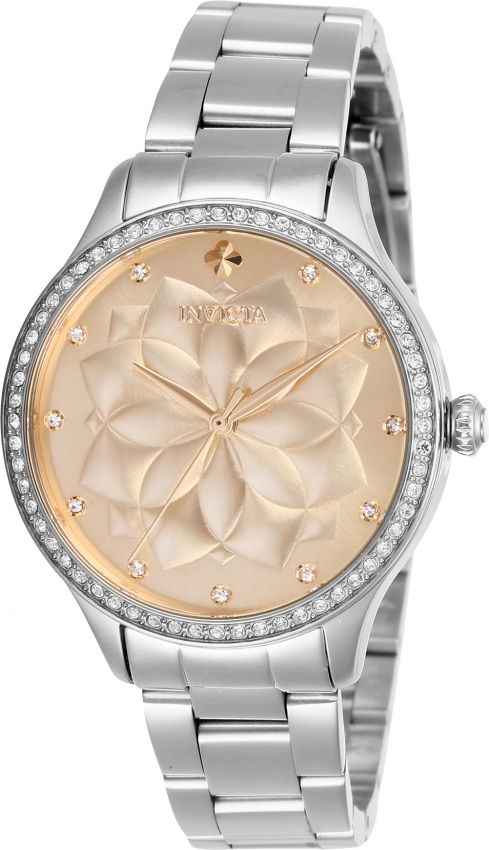 Silver-tone stainless steel case with a silver-tone stainless steel bracelet. Fixed silver-tone stainless steel and crystal bezel. Rose gold-tone dial with rose gold-tone leaf-style shape hands and crystal hour markers. Dial Type: Analog. SII Caliber PC11 quartz movement. Scratch resistant flame fusion crystal. Pull / push crown. Solid case back. Round case shape, case size: 35 mm, case thickness: 9.5 mm. Band width: 16 mm, band length: 6.75 inches. Fold over clasp. Water resistant at 100 meters / 330 feet. Functions: hour, minute, second. Wildflower series. Casual watch style. Watch label: Japan Movt. Invicta Wildflower Quartz Crystal Rose Gold-tone Dial Ladies Watch 28053.