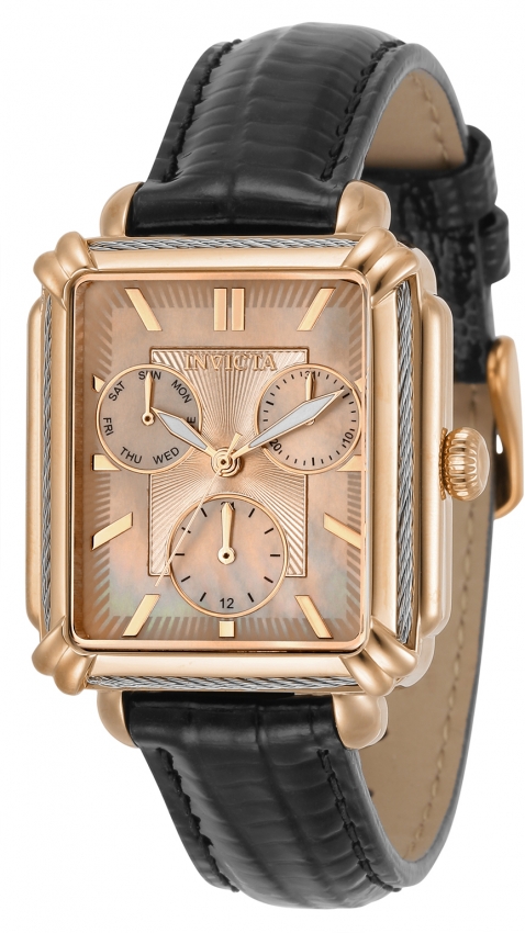 Rose gold-tone stainless steel case and bracelet. Fixed silver and rose gold stainless steel and cable bezel. Rose gold-tone dial with rose gold-tone hands and index hour markers. Minute markers around the outer rim. Dial Type: Analog. Luminescent hands. Date display at the 2 o'clock position. Three sub-dials displaying: date, day and 24 hour. Caliber VH68 quartz movement. Scratch resistant Flame Fusion crystal. Pull / push crown. Solid case back. Rectangle case shape, case size: 32 mm, case thickness: 10 mm. Band width: 16 mm, band length: 7.25 inches. Buckle clasp. Water resistant at 100 meters / 330 feet. Functions: date, day, GMT, second time zone, hour, minute, second. Wildflower Series. Dress watch style. Watch label: Japan Movt. Invicta Wildflower Quartz Rose Gold Dial Ladies Watch 30860.