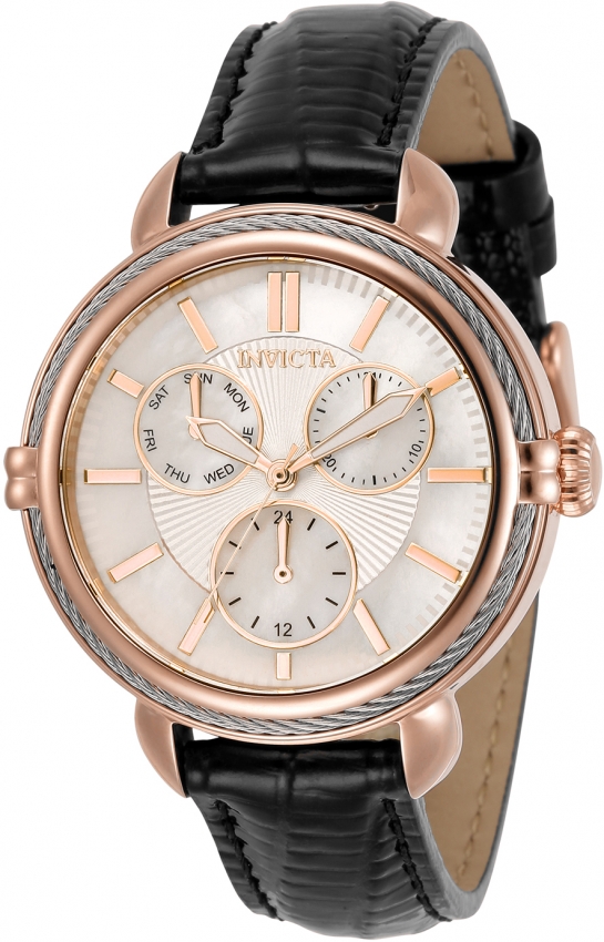 Rose gold-tone stainless steel case and bracelet. Fixed silver and rose gold stainless steel and cable bezel. White dial with rose gold-tone hands and index hour markers. Minute markers around the outer rim. Dial Type: Analog. Luminescent hands. Date display at the 2 o'clock position. Three sub-dials displaying: date, day and 24 hour. Caliber VH68 quartz movement. Scratch resistant Flame Fusion crystal. Pull / push crown. Solid case back. Round case shape, case size: 38 mm, case thickness: 10.5 mm. Band width: 16 mm, band length: 7.25 inches. Buckle clasp. Water resistant at 100 meters / 330 feet. Functions: date, day, GMT, second time zone, hour, minute, second. Wildflower Series. Dress watch style. Watch label: Japan Movt. Invicta Wildflower Quartz White Dial Ladies Watch 30850.