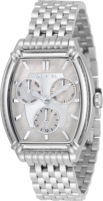 Silver-tone stainless steel case and bracelet. Fixed silver-tone stainless steel and cable bezel. White dial with silver-tone hands and index hour markers. Minute markers around the outer rim. Dial Type: Analog. Luminescent hands. Date display at the 2 o'clock position. Three sub-dials displaying: date, day and 24 hour. Caliber VH68 quartz movement. Scratch resistant Flame Fusion crystal. Pull / push crown. Solid case back. Tonneau case shape, case size: 34 mm, case thickness: 9 mm. Band width: 16 mm, band length: 7.25 inches. Fold over clasp. Water resistant at 100 meters / 330 feet. Functions: date, day, GMT, second time zone, hour, minute, second. Wildflower Series. Casual watch style. Watch label: Japan Movt. Invicta Wildflower Quartz White Dial Ladies Watch 30861.