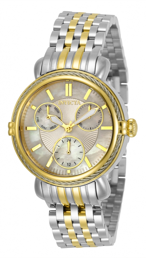 Silver-tone stainless steel case with a two-tone (silver-tone and gold-tone) stainless steel bracelet. Fixed gold and silver stainless steel and cable bezel. White dial with gold-tone hands and index hour markers. Minute markers around the outer rim. Dial Type: Analog. Luminescent hands. Date display at the 2 o'clock position. Three sub-dials displaying: date, day and 24 hour. Caliber VH68 quartz movement. Scratch resistant Flame Fusion crystal. Pull / push crown. Solid case back. Round case shape, case size: 34 mm, case thickness: 10.5 mm. Band width: 16 mm, band length: 7.25 inches. Fold over clasp. Water resistant at 100 meters / 330 feet. Functions: date, day, GMT, second time zone, hour, minute, second. Wildflower Series. Casual watch style. Watch label: Japan Movt. Invicta Wildflower Quartz White Dial Ladies Watch 30869.