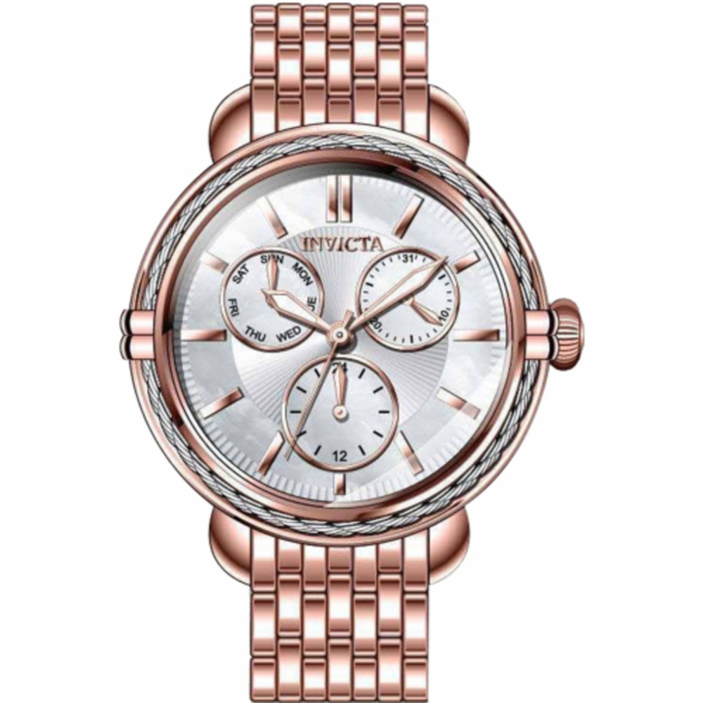 Rose gold-tone stainless steel case and bracelet. Fixed rose gold and silver cable and stainless steel bezel. White dial with rose gold-tone hands and index hour markers. Dial Type: Analog. Luminescent hands. Date display at the 2 o'clock position. Three sub-dials displaying: date, day and 24 hour. Caliber VH68 quartz movement. Scratch resistant Flame Fusion crystal. Pull / push crown. Solid case back. Round case shape, case size: 38 mm, case thickness: 10.5 mm. Band width: 16 mm, band length: 7.25 inches. Fold over clasp. Water resistant at 100 meters / 330 feet. Functions: date, day, GMT, second time zone, hour, minute, second. Wildflower Series. Casual watch style. Watch label: Japan Movt. Invicta Wildflower Quartz White Dial Ladies Watch 37273.
