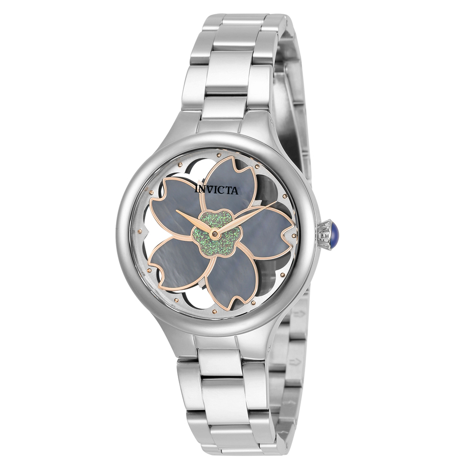 Silver-tone stainless steel case and bracelet. Fixed silver-tone stainless steel bezel. Silver and platinum and iridescent dial with gold-tone hands and index hour markers. Dial Type: Analog. Hattori Caliber PC10 quartz movement. Scratch resistant Flame Fusion crystal. Pull / push crown. Solid case back. Round case shape, case size: 35 mm, case thickness: 9.4 mm. Band width: 16 mm, band length: 7.25 inches. Fold over clasp. Water resistant at 100 meters / 330 feet. Functions: hour, minute. Wildflower Series. Casual watch style. Watch label: Japan Movt. Invicta Wildflower Rose Gold-tone Dial Quartz Ladies Watch 32085.