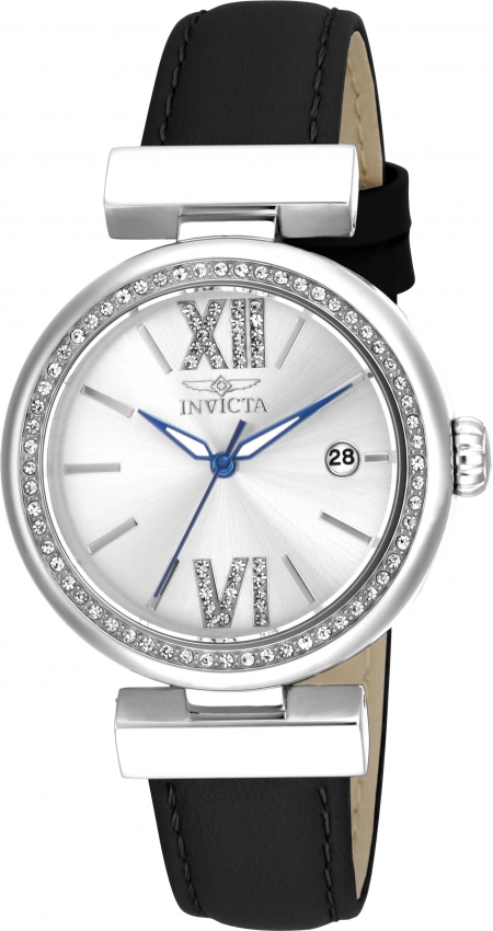 Silver-tone stainless steel case with a black leather strap. Fixed silver-tone crystal set bezel. White dial with blue hands and Roman numeral, index and crystal hour markers. Dial Type: Analog. Date display at the 3 o'clock position. Hattori Caliber PC32 quartz movement. Scratch resistant flame fusion crystal. Pull / push crown. Solid case back. Round case shape, case size: 36 mm, case thickness: 10.5 mm. Band width: 16 mm, band length: 7.75 inches. Buckle clasp. Water resistant at 50 meters / 165 feet. Functions: date, hour, minute, second. Dress watch style. Watch label: Japan Movt. Invicta Wildflower Quartz Crystal White Dial Ladies Watch 15542.
