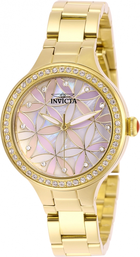 Yellow gold-tone stainless steel case and bracelet. Fixed yellow gold-tone bezel set with crystals. Mother of pearl dial with luminous yellow gold-tone hands and crystal hour markers. Dial Type: Analog. Luminescent hands. Hattori caliber PC21 quartz movement. Scratch resistant flame fusion crystal. Pull / push crown. Solid case back. Round case shape. Case size: 34 mm. Case thickness: 10.5 mm. Band width: 14 mm, band length: 7.25 inches. Fold over clasp with a push button release. Water resistant at 100 meters / 330 feet. Functions: hour, minute, second. Wildflower Series. Dress watch style. Watch label: Japan Movt. Invicta Wildflower Crystal Mother of Pearl Dial Ladies Watch 28822.