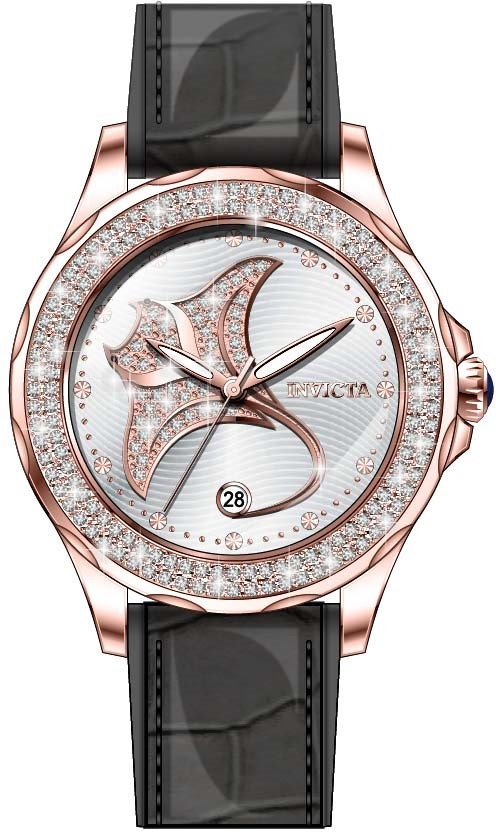 Rose gold-tone stainless steel case with a black silicone and leather strap. Rose gold-tone crystal set bezel. Silver-tone dial with rose gold-tone leaf-style shape hands and index hour markers. Minute markers around the outer rim. Dial Type: Analog. Luminescent hands. Date display at the 6 o'clock position. Hattori Caliber PC32 quartz movement. Scratch resistant flame fusion crystal. Pull / push crown. Solid case back. Round case shape. Case size: 38 mm. Band width: 18 mm, band length: 7.50 inches. Water resistant at 100 meters / 330 feet. Functions: date, hour, minute, second. Casual watch style. Watch label: Japan Movt. Invicta Wildflower Manta Ray Quartz Crystal Silver Dial Ladies Watch 32668.