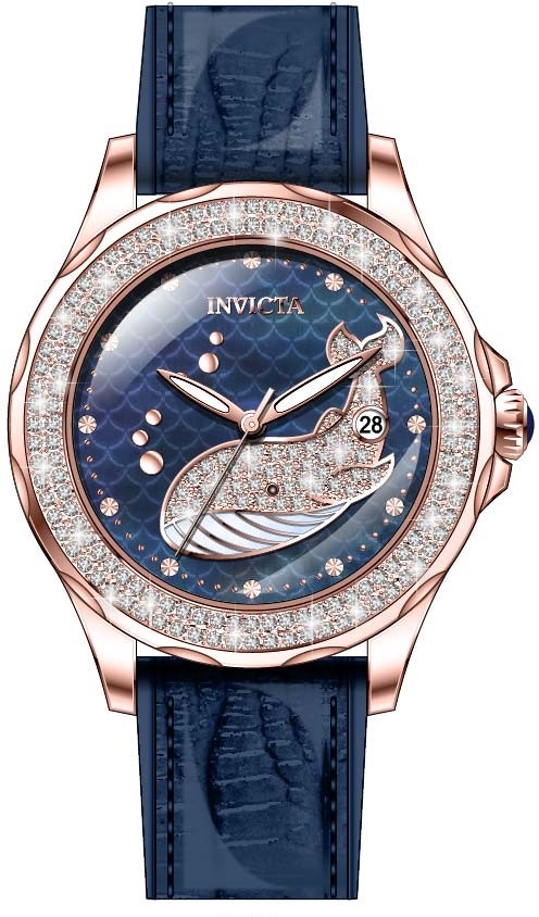 Rose gold-tone stainless steel case with a blue silicone and leather strap. Rose gold-tone crystal set bezel. Blue dial with rose gold-tone leaf-style shape hands and index hour markers. Minute markers around the outer rim. Dial Type: Analog. Luminescent hands. Date display at the 3 o'clock position. Hattori Caliber PC32 quartz movement. Scratch resistant flame fusion crystal. Pull / push crown. Solid case back. Round case shape. Case size: 38 mm. Band width: 18 mm, band length: 7.50 inches. Water resistant at 100 meters / 330 feet. Functions: date, hour, minute, second. Casual watch style. Watch label: Japan Movt. Invicta Wildflower Whale Quartz Crystal Blue Dial Ladies Watch 32671.