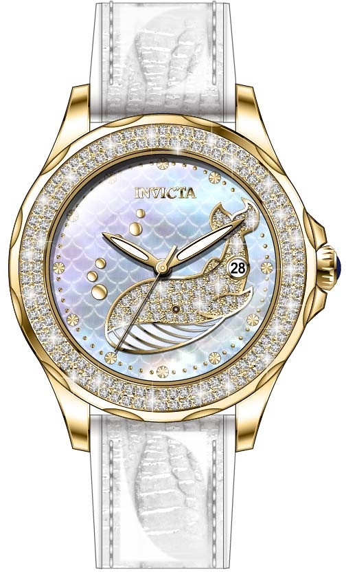 Gold-tone stainless steel case with a white silicone and leather strap. Gold-tone crystal set bezel. Platinum dial with gold-tone leaf-style shape hands and index hour markers. Minute markers around the outer rim. Dial Type: Analog. Luminescent hands. Date display at the 3 o'clock position. Hattori Caliber PC32 quartz movement. Scratch resistant flame fusion crystal. Pull / push crown. Solid case back. Round case shape. Case size: 38 mm. Band width: 18 mm, band length: 7.50 inches. Water resistant at 100 meters / 330 feet. Functions: date, hour, minute, second. Casual watch style. Watch label: Japan Movt. Invicta Wildflower Whale Quartz Crystal Ladies Watch 32672.