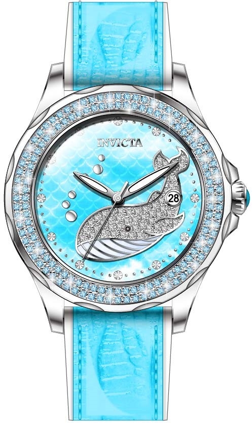 Silver-tone stainless steel case with a blue and white silicone and leather strap. Silver-tone crystal set bezel. Blue dial with silver-tone leaf-style shape hands and index hour markers. Minute markers around the outer rim. Dial Type: Analog. Luminescent hands. Date display at the 3 o'clock position. Hattori Caliber PC32 quartz movement. Scratch resistant flame fusion crystal. Pull / push crown. Solid case back. Round case shape. Case size: 38 mm. Band width: 18 mm, band length: 7.50 inches. Water resistant at 100 meters / 330 feet. Functions: date, hour, minute, second. Casual watch style. Watch label: Japan Movt. Invicta Wildflower Whale Quartz Crystal Blue Dial Ladies Watch 32673.