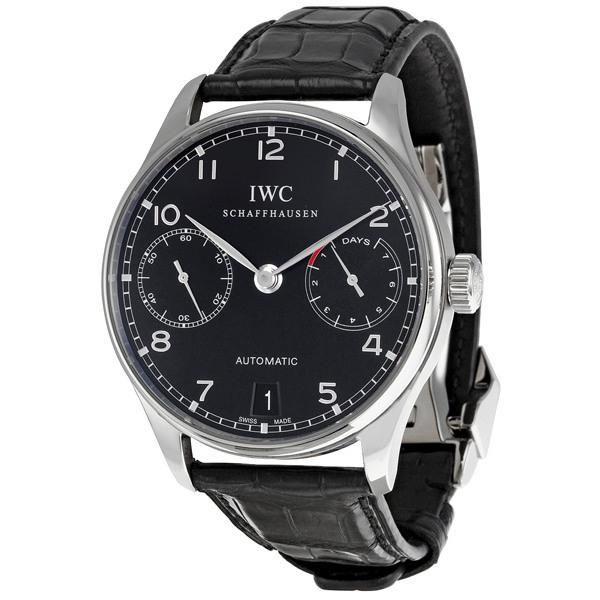 Silver-tone stainless steel case with a black crocodile leather strap. Fixed silver-tone stainless steel bezel. Black dial with silver-tone leaf-style shape hands and Arabic numeral hour markers. Minute markers around the outer dial. Dial Type: Analog. Luminescent hands and dial markers. Date display at the 6 o'clock position. Two sub-dials displaying: 60-second, 7 day power reserve. IWC Calibre 51010 Automatic movement, based upon IWC 50010, containing 44 Jewels, bitting at 21600 vph, and has a power reserve of approximately 168 hours. Scratch resistant sapphire crystal. Stainless steel, fluted crown. Screw down sapphire crystal exhibition case back. Round case shape, case size: 42.3 mm, case thickness: 13.9 mm. Deployment clasp. Water resistant at 30 meters / 100 feet. Functions: hours, minutes, small seconds (with stop function) at 9 o'clock, power reserve at 3 o'clock, calendar. Portuguese Automatic Series. Sport watch style. Watch label: Swiss Made. Item Variations: 5001-09, 5001/09, 500109, IWC-5001-09 IW500109, 5001-09, 5001/09, 500109, IWC-50. IWC Portuguese Automatic Black Dial Steel Black Mens Watch IW500109.