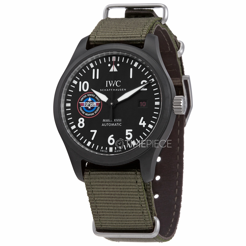 Black ceramic case with a green textile strap. Fixed black ceramic bezel. Black dial with luminous black hands and Arabic numeral hour markers. Minute markers around the outer rim. Dial Type: Analog. Luminescent hands and markers. Date display at the 3 o'clock position. IWC calibre 35111 automatic movement, based upon Sellita SW300-1, containing 25 Jewels, composed of 163 parts, bitting at 28800 vph, and has a power reserve of approximately 42 hours. Scratch resistant sapphire crystal. Screw down crown. Solid case back. Round case shape. Case size: 41 mm. Case thickness: 11 mm. Band width: 20 mm. Tang clasp. Water resistant at 60 meters / 200 feet. Functions: date, hour, minute, second. Pilots Mark Xviii Top Gun Sfti Series. Luxury watch style. Watch label: Swiss Made. IWC Pilots Mark XVIII Top Gun SFTI Automatic Black Dial Mens Watch IW324712.