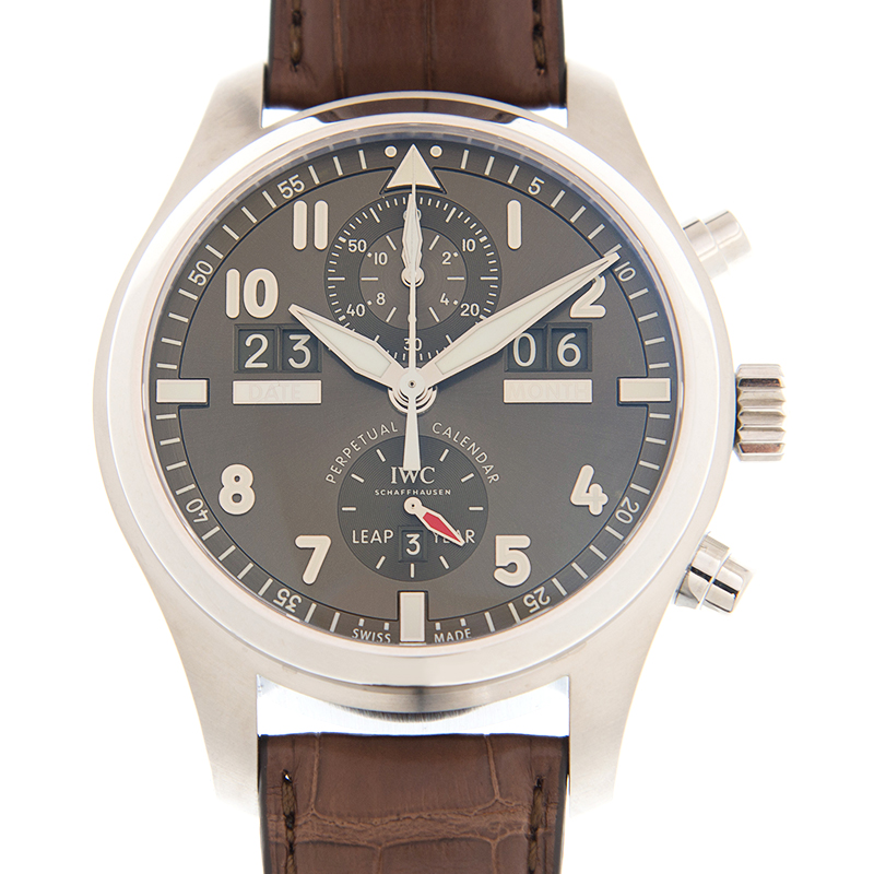 Silver-tone stainless steel case with a brown crocodile leather strap. Fixed silver-tone stainless steel bezel. Slate dial with silver-toned hands and Arabic numeral hour markers. Minute markers around the outer rim. Dial Type: Analog. Luminescent hands and markers. Perpetual calendar. Chronograph - two sub-dials displaying: combined hour and minute totalizer and small hacking seconds sub-dials. IWC Calibre 89801 Automatic movement, containing 51 Jewels, bitting at 28800 vph, and has a power reserve of approximately 68 hours. Scratch resistant sapphire crystal. Round case shape, case size: 46 mm. Water resistant at 60 meters / 200 feet. Functions: leap year, month, date, hour, minute, second, flyback chronograph, perpetual calendar. Pilot Spitfire Perpetual Calendar Series. Pilot watch style. Watch label: Swiss Made. IWC Pilot Spitfire Perpetual Calendar Automatic Mens Watch IW379107.