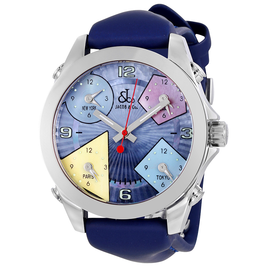 Stainless steel case with a blue polyurethane strap. Fixed stainless steel bezel. Mother of pearl / multi-color dial with luminous silver-tone hands. Arabic numerals mark the 3, 6, 9 and 12 o'clock positions. Dial Type: Analog. Luminescent hands. Four time zone sub-dials subdials. Quartz movement. Scratch resistant sapphire crystal. Solid case back. Round case shape. Case size: 40 mm. Fold over clasp. Water resistant at 100 meters / 330 feet. Functions: hour, minute, second, five time zones, world time. Luxury watch style. Watch label: Swiss Made. Jacob and Co. Five Time Zone Multi-Color Mother of Pearl Unisex Watch JCM-23.