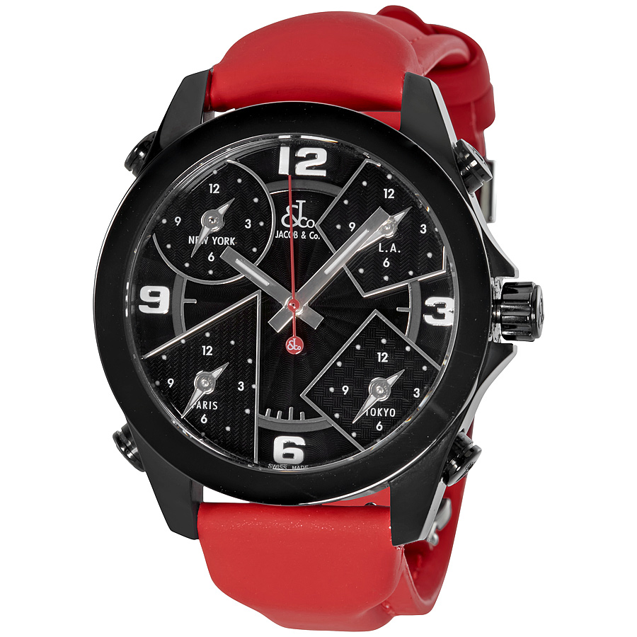 Black PVD stainless steel case with a red polyurethane strap. Fixed black PVD bezel. Black dial with luminous silver-tone hands. Arabic numerals mark the 3, 6, 9 and 12 o'clock position. Dial Type: Analog. Luminescent hands. Four time zone sub-dials subdials. Quartz movement. Scratch resistant sapphire crystal. Solid case back. Round case shape. Case size: 40 mm. Fold over clasp. Water resistant at 30 meters / 100 feet. Functions: hour, minute, second, five time zones, world time. Luxury watch style. Watch label: Swiss Made. Jacob and Co. Five Time Zone Black Dial Mens Watch JCM-2BC.