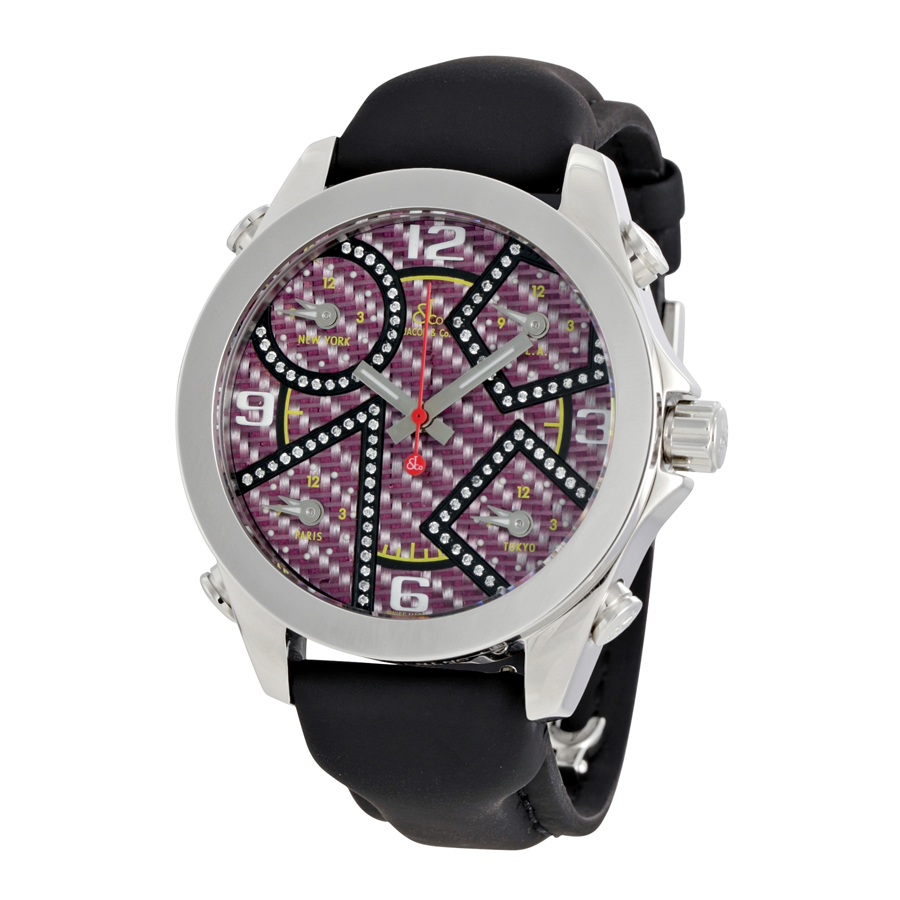 Stainless steel case with a black polyurethane strap. Fixed stainless steel bezel. Carbon fiber dial with luminous silver-tone hands. Arabic numerals mark the 3, 6, 9 and 12 o'clock positions. Dial Type: Analog. Luminescent hands. Four time zone sub-dials: New York, L.A., Paris and Tokyo. Quartz movement. Scratch resistant sapphire crystal. Solid case back. Round case shape. Case size: 40 mm. Fold over clasp. Water resistant at 100 meters / 330 feet. Functions: hour, minute, second, five time zones, world time. Additional Info: features diamond accent on the dial. Luxury watch style. Watch label: Swiss Made. Jacob Co Five Time Zone Carbon Fiber Diamond Dial Mens Watch JCM-93DA.