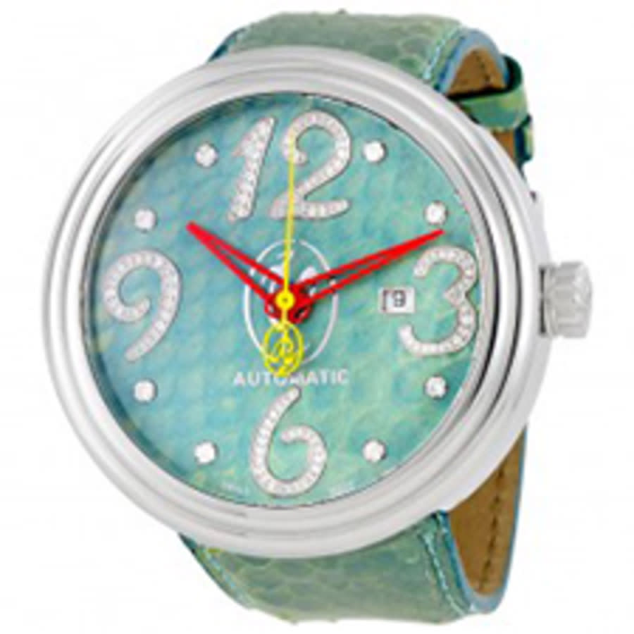 Stainless steel case with a yellow leather strap. Fixed bezel. Mother of pearl dial with red hands and Arabic- diamond numeral hour markers. Dial Type: Analog. Date display at the 3 o'clock position. Automatic movement. Scratch resistant sapphire crystal. Skeleton transparent exhibition see through case back. Case size: 48 mm. Case thickness: 14 mm. Round case shape. Water resistant at 100 meters / 330 feet. Functions: date, hour, minute, second. Luxury watch style. Watch label: Swiss Made. Jacob Co. Valentin Yudashkin Automatic Mens Watch WVY-008.