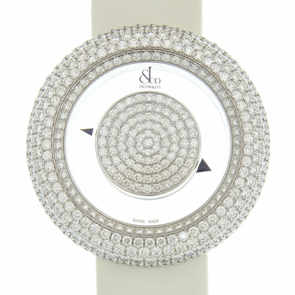 18kt white gold case with a white silk strap. Fixed bezel with diamond set 18kt white gold. Silver-tone dial with black hands. Dial Type: Analog. Quartz movement. Scratch resistant sapphire crystal. Transparent see through case back. Round case shape, case size: 44 mm. Buckle clasp. Functions: hour, minute. Additional Info: original box, international warranty card, manual (complete accessories). Brilliant Series. Luxury watch style. Watch label: Swiss Made. Jacob Co. Brilliant Quartz Diamond Silver Dial Unisex Watch BM55630RDRDA.