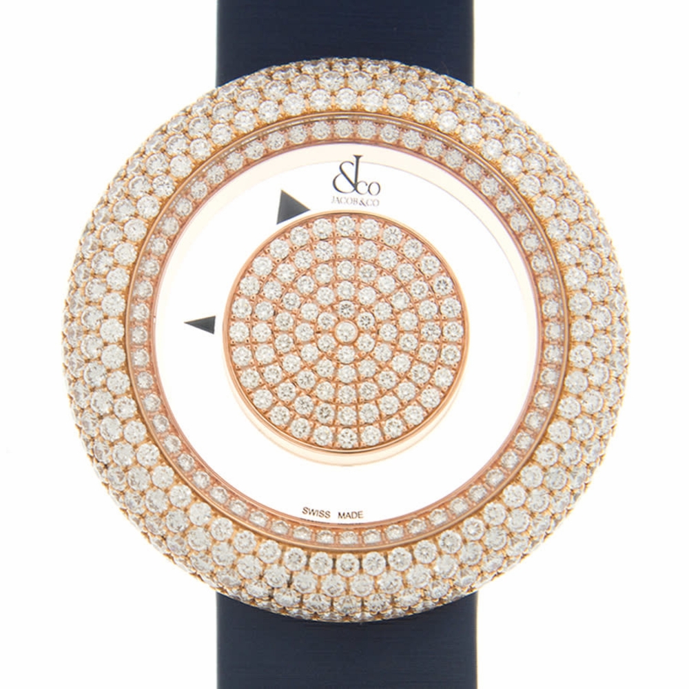 Rose gold-tone 18kt rose gold case with a blue silk strap. Fixed rose gold-tone bezel with diamond set 18kt rose gold. Transparent dial with black hands. Dial Type: Analog. Quartz movement. Scratch resistant sapphire crystal. Transparent see through case back. Round case shape, case size: 44 mm. Buckle clasp. Functions: hour, minute. Additional Info: original box, international warranty card, manual (complete accessories). Brilliant Series. Luxury watch style. Watch label: Swiss Made. Jacob Co. Brilliant Quartz Diamond Unisex Watch BM55640RDRDABSAA.