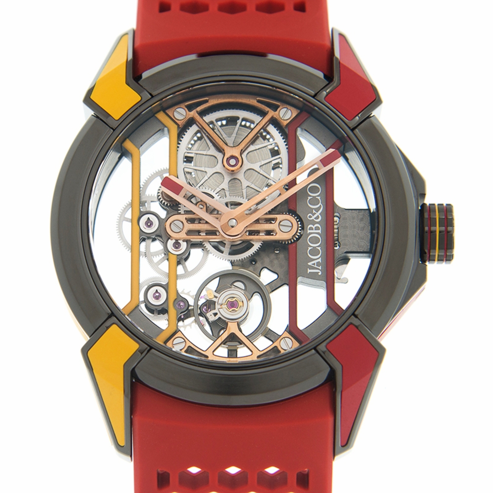 Black titanium case with a red rubber strap. Fixed black titanium bezel. Transparent dial with rose gold-tone hands. Dial Type: Analog. Hand wind movement. Scratch resistant sapphire crystal. Transparent see through case back. Round case shape, case size: 36 mm. Buckle clasp. Water resistant at 50 meters / 165 feet. Functions: hour, minute, second. Epic X Series. Luxury watch style. Watch label: Swiss Made. Jacob Co. Epic X Hand Wind Mens Watch EX100.21.CR.CB.ALD4A.