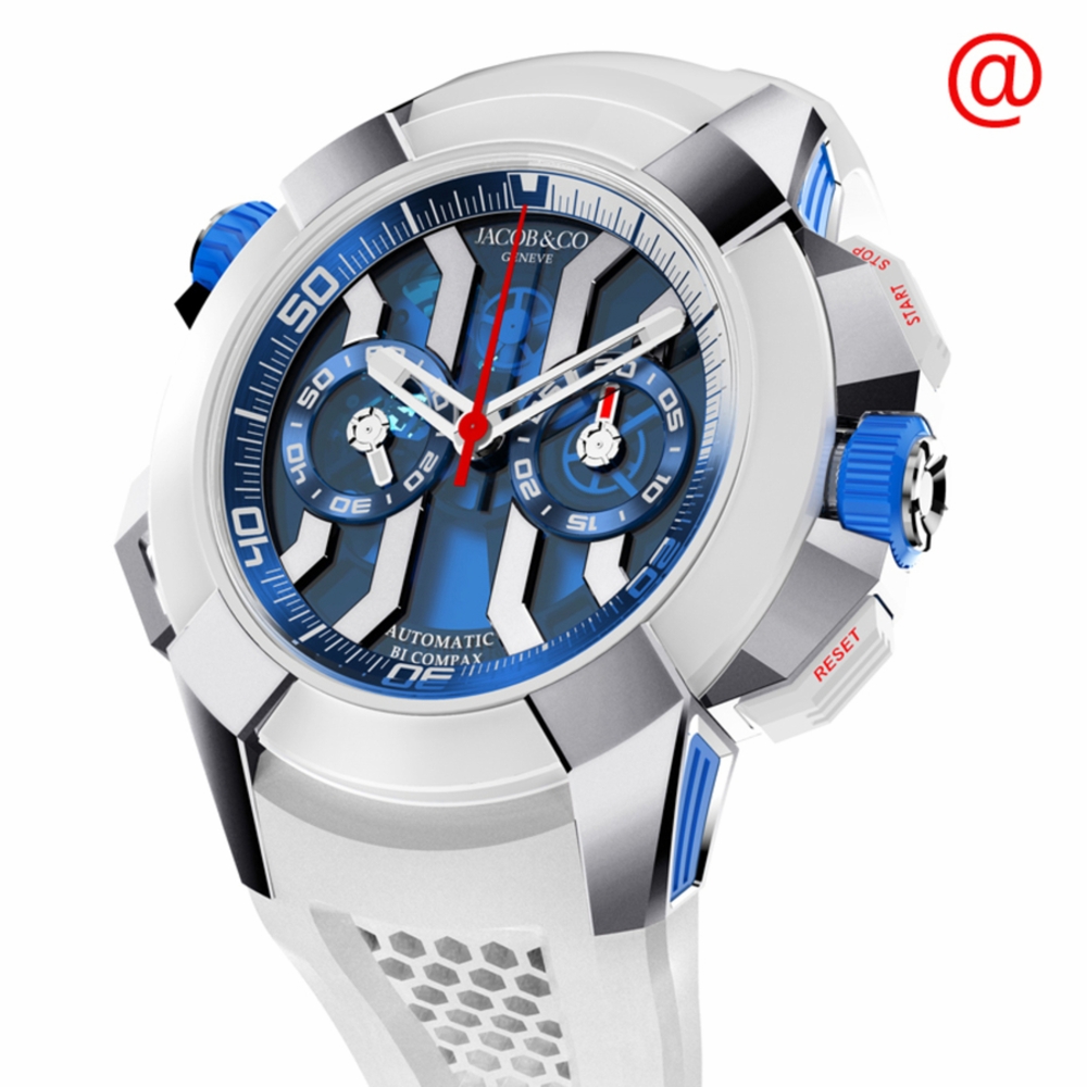 Titanium case with a white rubber strap. Titanium titanium bezel. Blue dial. Dial Type: Analog. Automatic movement. Scratch resistant sapphire crystal. Transparent case back. Round case shape. Case size: 46 mm. Tang clasp. Water resistant at 30 meters / 100 feet. Functions: hour, minute, second. Additional Info: original box, international warranty card, manual (complete accessories). Luxury watch style. Watch label: Swiss Made. Jacob Co. EPIC X Blue Dial Unisex Watch EC31320PELLGHB4D.