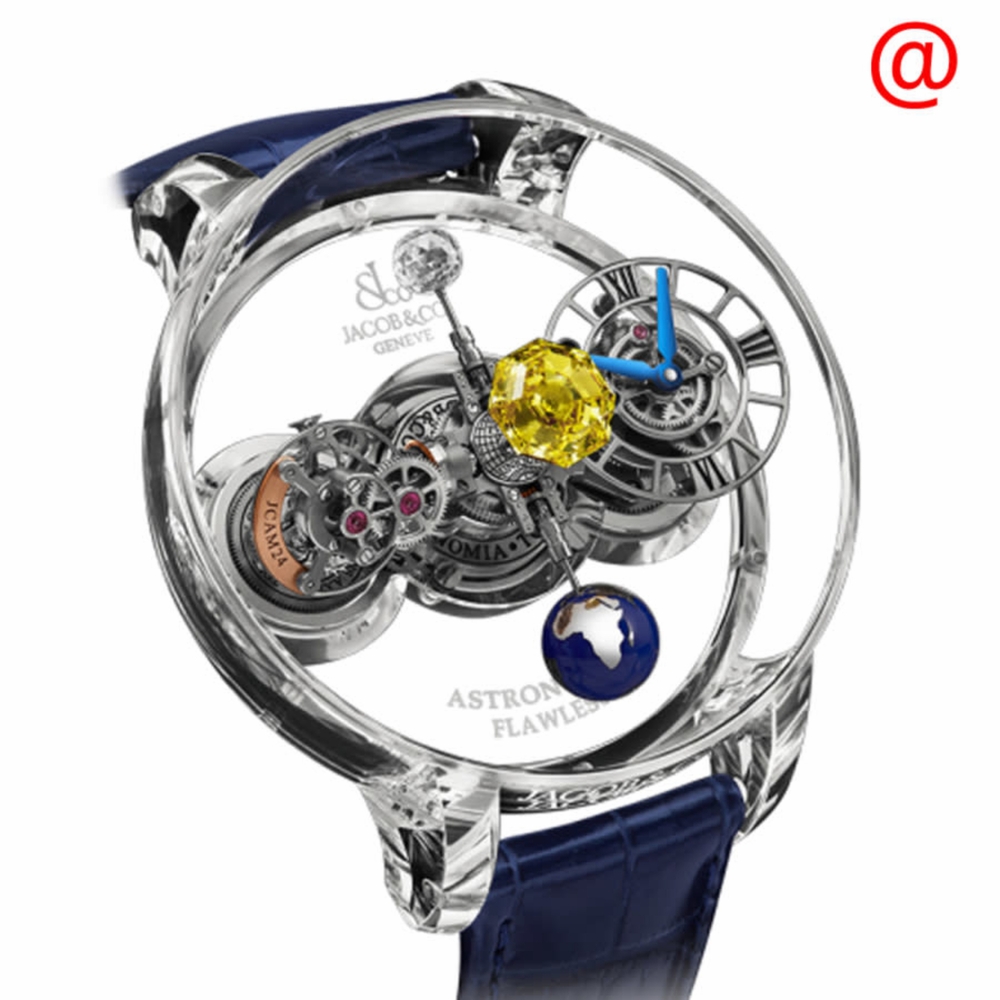 18kt white gold case with a blue leather strap. Fixed 18kt white gold bezel. Transparent dial with blue hands and Roman numeral hour markers. Dial Type: Analog. Jacob & Co. Calibre JCAM 24 hand wind movement with a 60-hour power reserve. Scratch resistant sapphire crystal. Transparent see through case back. Round case shape, case size: 50 mm. Fold over clasp. Water resistant at 30 meters / 100 feet. Functions: hour, minute, second. Additional Info: original box, international warranty card, manual (complete accessories). Astronomia Series. Luxury watch style. Watch label: Swiss Made. Jacob Co. Astronomia Hand Wind Mens Watch AT125.80.AA.UC.BBALA.