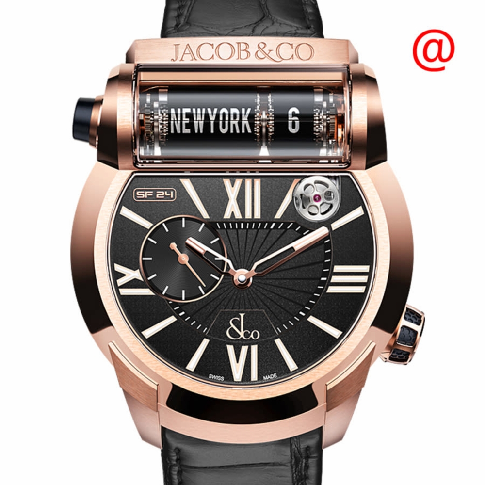 18kt rose gold case with a black leather strap. Fixed bezel. Black dial with Roman numeral hour markers. Dial Type: Analog. Jacob & Co. Calibre JCAA02 automatic movement with a 48-hour power reserve. Scratch resistant sapphire crystal. Case size: 45 mm. Deployment clasp. Water resistant at 30 meters / 100 feet. Functions: hours, minutes and seconds, instantaneous 24-hour world time indication. Additional Info: 101 pieces. Luxury watch style. Watch label: Swiss Made. Jacob Co. EPIC SF24 Black Dial Unisex Watch ES10140NSLRACA4D.