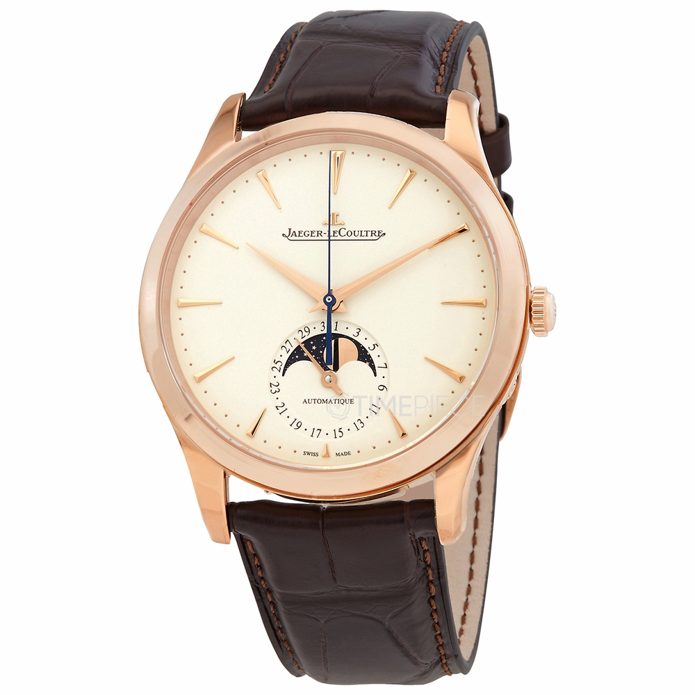 Brown leather strap. Fixed bezel. Eggshell beige dial with index hour markers. Dial Type: Analog. One subdial displaying: date/moonphase. Jaeger LeCoultre Calibre 925/1 Automatic movement, containing 38 Jewels, composed of 253 parts, bitting at 28800 vph, and has a power reserve of approximately 43 hours. Scratch resistant sapphire crystal. Transparent see through case back. Round case shape, case size: 39 mm, case thickness: 9 mm. Band width: 21 mm. Water resistant at 50 meters / 165 feet. Functions: moon phase, date, minute, second. Master Series. Luxury watch style. Watch label: Swiss Made. Jaeger Lecoultre Master Ultra Thin Automatic Mens Watch Q1362510.
