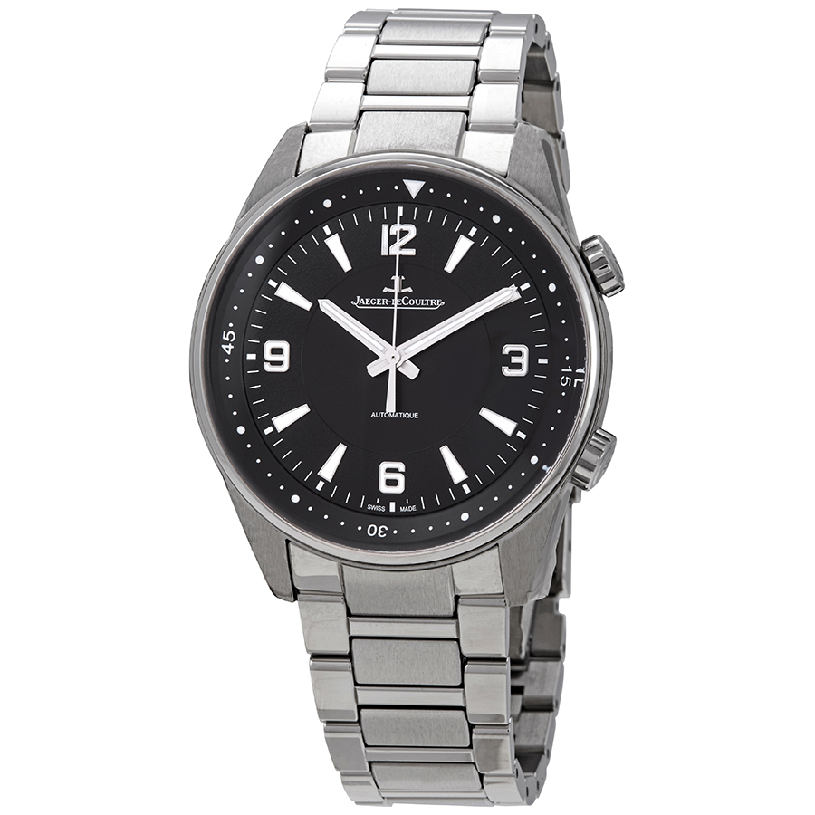 Stainless steel case with a stainless steel bracelet. Fixed stainless steel bezel. Black dial with luminous silver-tone hands and index hour markers. Arabic numerals appear at the 3, 6, 9 and 12 o'clock positions. Minute scale around the inner rim. Dial Type: Analog. Luminescent hands and markers. Jaeger LeCoultre calibre 898E/1 automatic movement with a 38-hour power reserve. Scratch resistant sapphire crystal. Screw down crown. Transparent case back. Round case shape. Case size: 41 mm. Case thickness: 11.2 mm. Band width: 20 mm. Water resistant at 100 meters / 330 feet. Functions: hour, minute, second. Luxury watch style. Watch label: Swiss Made. Jaeger LeCoultre Polaris Black Dial Automatic Mens Steel Watch 9008170.