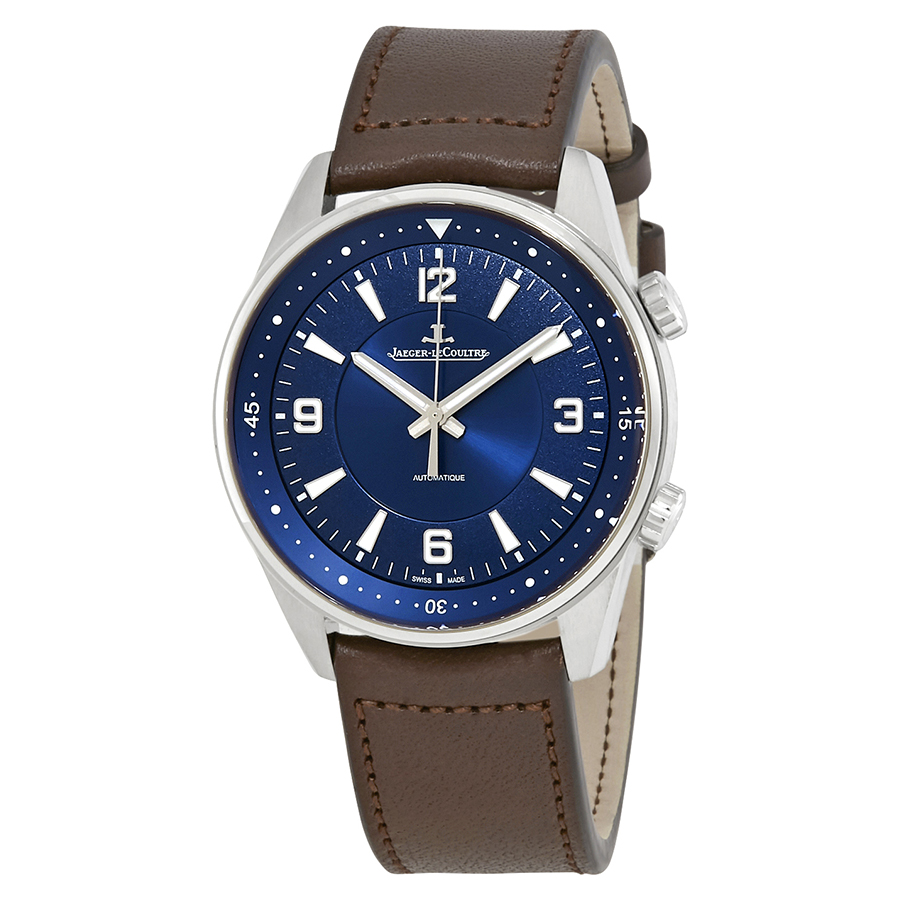 Silver-tone stainless steel case with a brown calfskin leather strap. Fixed silver-tone stainless steel bezel. Blue dial with silver-tone hands and index-Arabic numerals hour markers. Minute markers around the outer rim. Dial Type: Analog. Jaeger LeCoultre Calibre 898E/1 Automatic movement, containing 30 Jewels, composed of 195 parts, bitting at 28800 vph, and has a power reserve of approximately 38 hours. Scratch resistant sapphire crystal. Transparent case back. Round case shape, case size: 41 mm, case thickness: 11.2 mm. Water resistant at 100 meters / 330 feet. Functions: hour, minute, second. Polaris Series. Luxury watch style. Watch label: Swiss Made. Jaeger LeCoultre Polaris Blue Dial Automatic Mens Watch Q9008480.