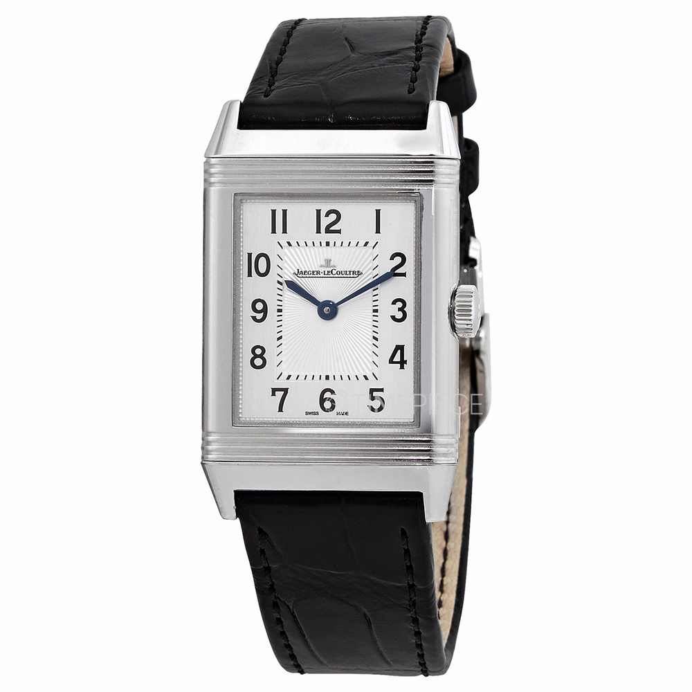 Silver-tone stainless steel case with a black leather strap. Fixed silver-tone stainless steel bezel. Silver (sunburst guilloche center) dial with blue hands and Roman numeral hour markers. Minute markers around an inner ring. Dial Type: Analog. Jaeger LeCoultre calibre 822A/2 hand wind movement, containing 21 Jewels, bitting at 21600 vph, and has a power reserve of approximately 45 hours. Scratch resistant sapphire crystal. Solid case back. Rectangle case shape. Case dimensions: 40 mm x 24.4 mm. Case thickness: 7.56 mm. Deployment clasp. Water resistant at 30 meters / 100 feet. Functions: hour, minute. Reverso Classic Medium Series. Luxury watch style. Watch label: Swiss Made. Jaeger LeCoultre Reverso Classic Medium Hand Wind Silver Dial Mens Watch Q2548440.