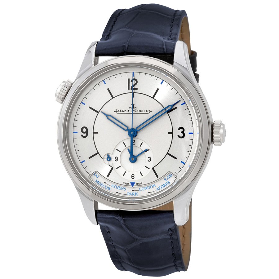 Silver-tone stainless steel case with a navy blue alligator leather strap. Fixed silver-tone stainless steel bezel. Silver dial with blue skeleton hands and index hour markers. Arabic numerals mark the 3, 9 and 12 o'clock positions. minute markers around the outer rim. Dial Type: Analog. One subdial displaying: second time zone. Jaeger LeCoultre Calibre 939B/1 Automatic movement, containing 34 Jewels, bitting at 28800 vph, and has a power reserve of approximately 43 hours. Scratch resistant sapphire crystal. Transparent see through case back. Round case shape, case size: 39 mm, case thickness: 11.77 mm. Tang clasp. Water resistant at 50 meters / 165 feet. Functions: GMT, second time zone, hour, minute, second. Master Geographic Series. Luxury watch style. Watch label: Swiss Made. Jaeger LeCoultre Master Geographic Automatic Mens Watch Q1428530.