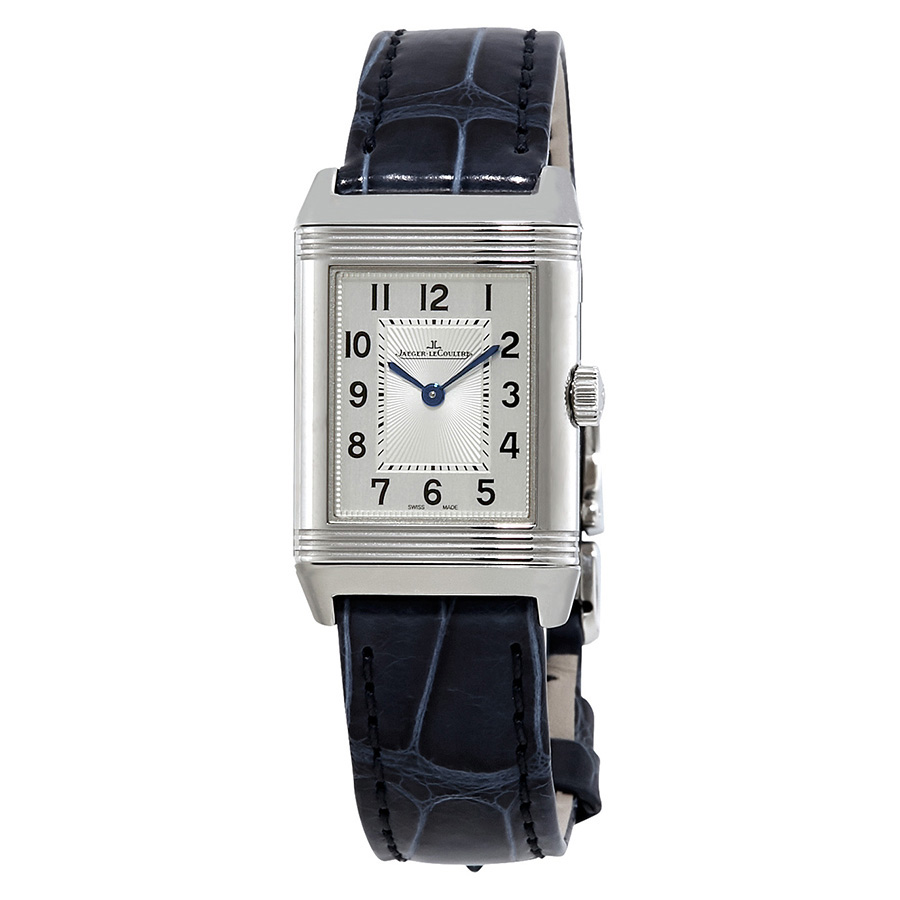Stainless steel case with a blue leather strap. Fixed stainless steel bezel. Silver reverso dial with blue sword-shaped hands and black Arabic numeral hour markers. Minute markers around an inner ring. Dial Type: Analog. Jaeger LeCoultre calibre JLC 844 hand wind movement, containing 18 Jewels, bitting at 21600 vph, and has a power reserve of approximately 38 hours. Scratch resistant sapphire crystal. Pull / push crown. Solid case back. Rectangle case shape. Case dimensions: 34.2 mm x 21 mm. Case thickness: 8.7 mm. Deployment clasp. Water resistant at 30 meters / 100 feet. Functions: hour, minute. Additional Info: gems:diamond:~30 ~0.28 carats. Reverso Classic Series. Luxury watch style. Watch label: Swiss Made. Jaeger LeCoultre Reverso Classic Ladies Hand Wound Watch Q2668432.