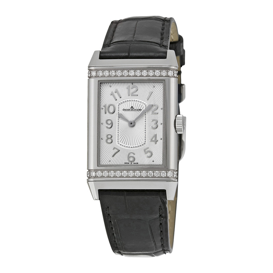 Silver-tone stainless steel case with a black (alligator) leather strap. Fixed silver-tone bezel with diamond set. Silver guilloche dial with silver-tone sword-shaped hands and Arabic numeral hour markers. Minute markers around an inner ring. Dial Type: Analog. Jaeger LeCoultre Calibre JLC 846/1 Hand Wind movement, containing 17 Jewels, composed of 93 parts, bitting at 21600 vph, and has a power reserve of approximately 40 hours. Scratch resistant sapphire crystal. Pull / push crown. Solid case back. Rectangle case shape, case size: 40 mm x 24 mm, case thickness: 7.2 mm. Band width: 20 mm. Deployment with push button release clasp. Water resistant at 30 meters / 100 feet. Functions: hour, minute. Grande Reverso Lady Ultra Thin Series. Luxury watch style. Watch label: Swiss Made. Item Variations: Q3208423, 3208423, 320.84.23, Q320.84.23. Jaeger LeCoultre Grande Reverso Silver Dial Black Leather Ladies Watch Q3208423.