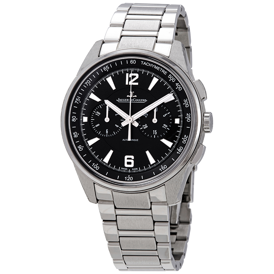 Stainless steel case with a stainless steel bracelet. Fixed stainless steel bezel. Black dial with luminous silver-tone hands and index hour markers. Arabic numerals mark the 6 and 12 o'clock positions. Minute markers. Tachymeter markings around the outer rim. Dial Type: Analog. Luminescent hands and markers. Chronograph - two sub-dials displaying: 30 minute and 12 hour. Jaeger LeCoultre calibre 751H automatic movement, based upon Jaeger LeCoultre calibre 751, containing 37 Jewels, bitting at 28800 vph, and has a power reserve of approximately 65 hours. Scratch resistant sapphire crystal. Pull / push crown. Transparent case back. Round case shape. Case size: 42 mm. Case thickness: 11.9 mm. Band width: 20 mm. Deployment clasp. Water resistant at 100 meters / 330 feet. Functions: chronograph, tachymeter, hour, minute, second. Polaris Series. Luxury watch style. Watch label: Swiss Made. Jaeger LeCoultre Polaris Automatic Chronograph Black Dial Mens Watch Q9028170.