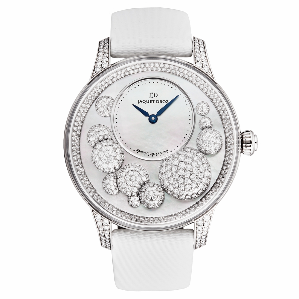 18k white gold case with a white satin bracelet. Fixed inner bezel set with diamonds. Mother of pearl dial with blued steel hands and black printed dot hour markers. Dial Type: Analog. Automatic movement. Caliber 2653 engine. Scratch resistant sapphire crystal. Skeleton transparent exhibition see through case back. Case diameter: 41 mm. Round case shape. Tang clasp. Water resistant at 30 meters / 100 feet. Functions: hour, minute. Luxury watch style. Jaquet Droz Petite Heure Minute Celeste Mother Of Pearl Dial Automatic Ladies Watch J005024533.