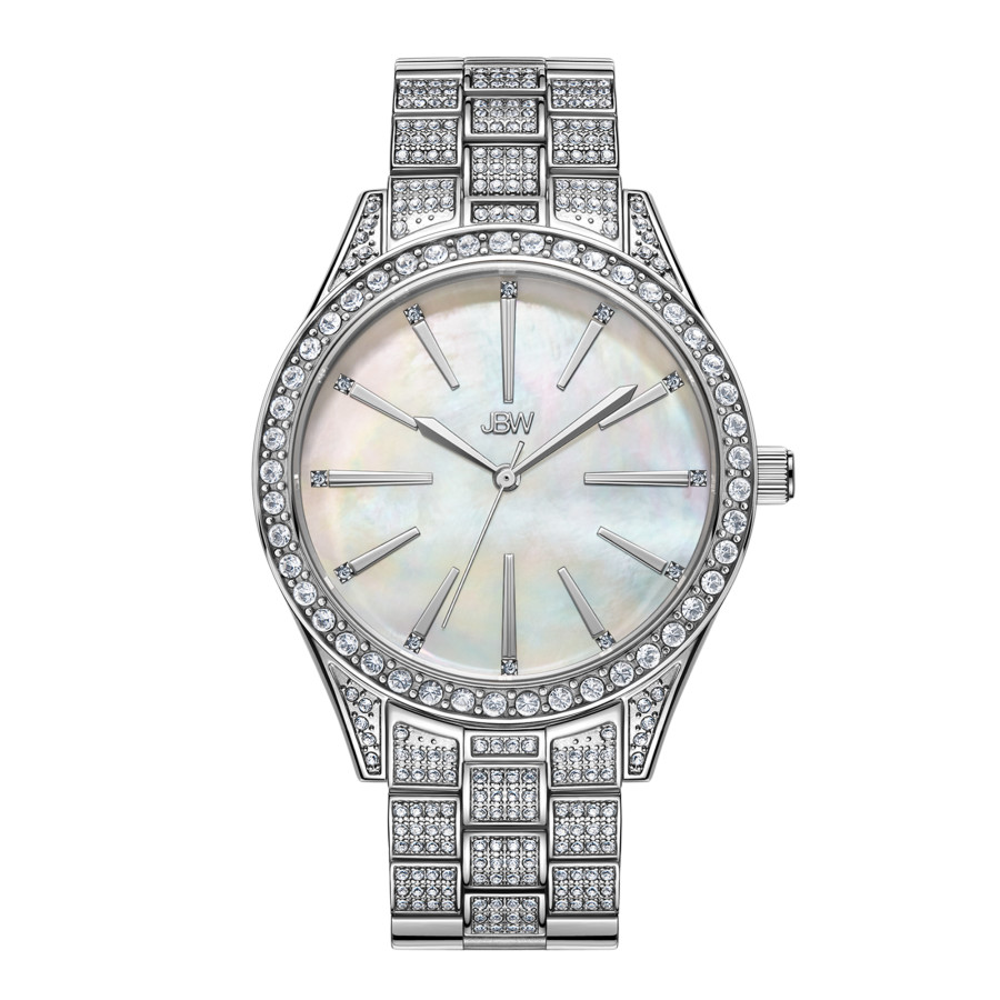 Silver-tone stainless steel case with a silver-tone stainless steel bracelet. Fixed silver-tone stainless steel bezel. Mother of pearl dial with silver-tone sword-shaped hands and index & diamond hour markers. Dial Type: Analog. Quartz movement. Scratch resistant mineral crystal. Pull / push crown. Solid case back. Round case shape, case size: 39 mm, case thickness: 10 mm. Band width: 18 mm, band length: 7.5 inches. Deployment with push button release clasp. Water resistant at 50 meters / 165 feet. Functions: hour, minute, second. Additional Info: 12 diamonds. Luxury watch style. JBW Cristal Gem Quartz Diamond Ladies Watch J6382C.