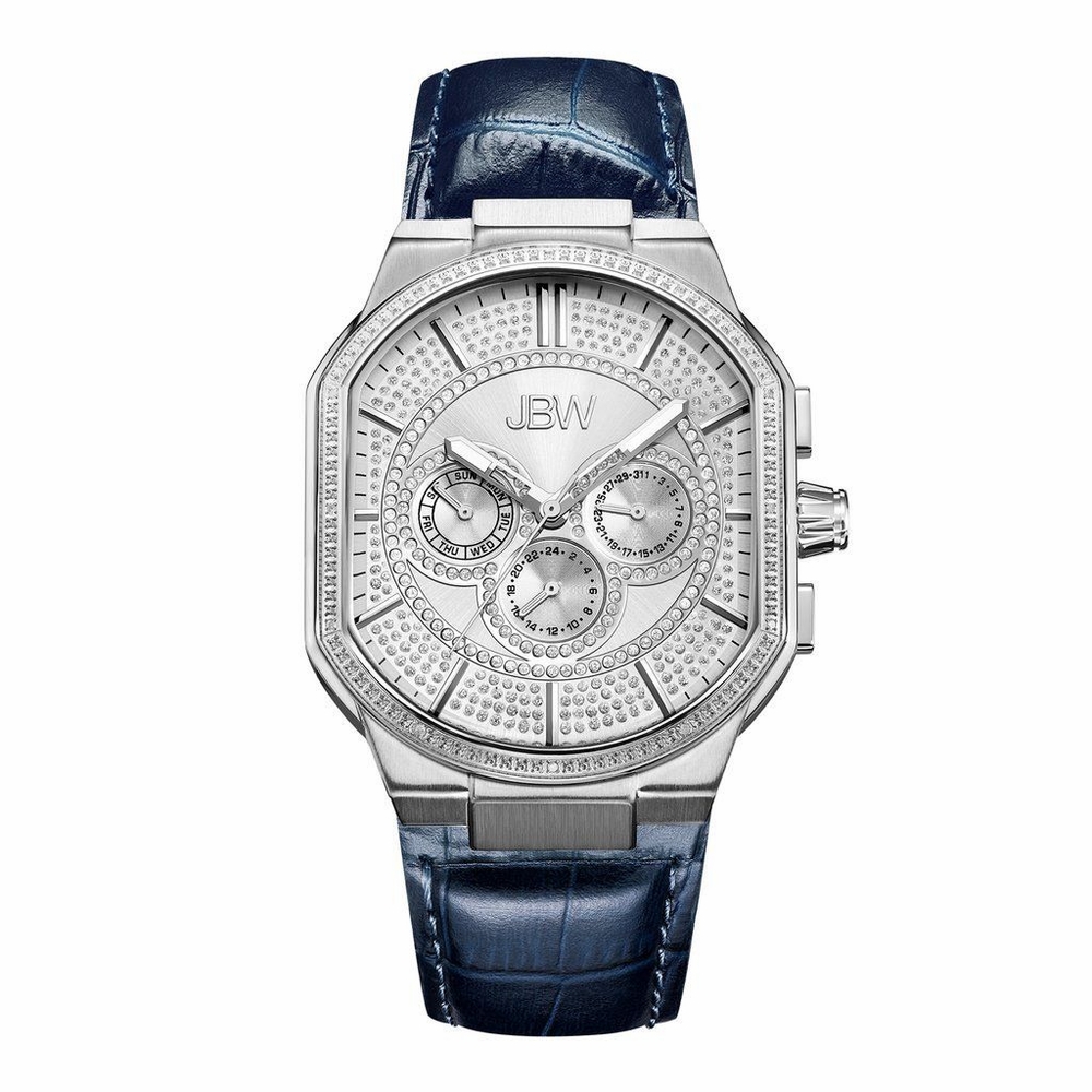 Silver-tone stainless steel case with a navy calfskin leather strap. Fixed silver-tone stainless steel bezel. Silver dial with silver-tone hands and index hour markers. Dial Type: Analog. Luminescent hands. Quartz movement. Scratch resistant mineral crystal. Solid case back. Oval case shape. Case size: 43 mm. Buckle clasp. Water resistant at 100 meters / 330 feet. Functions: date, day, hour, minute, second. Casual watch style. JBW Orion Silver Leather Ladies J6342A.